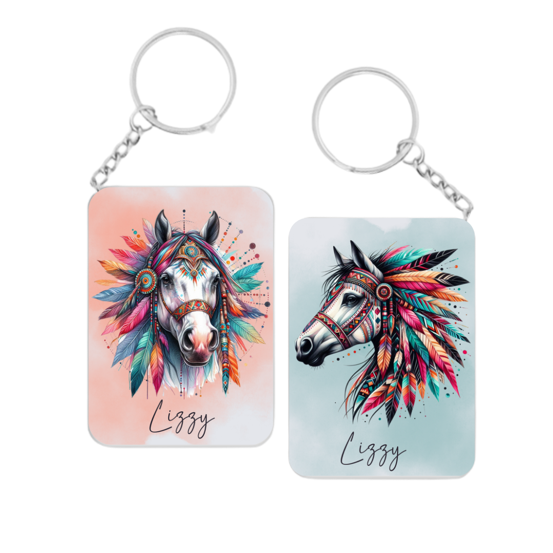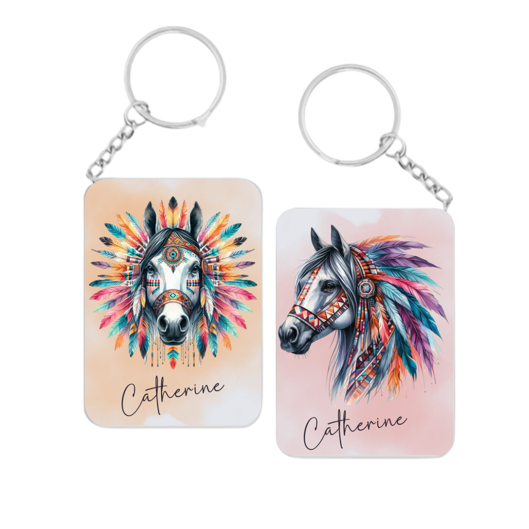 Add a touch of wild spirit to your backpack, handbag or keys with our Personalised Native American Horse keyring. This double-sided keyring features two stunning watercolour horses adorned with vibrant tribal feather headdresses and the lucky recipient's name in a stylish bohemian script font. It's perfect for horse lovers, boho style enthusiasts, and anyone who adores unique equestrian accessories.