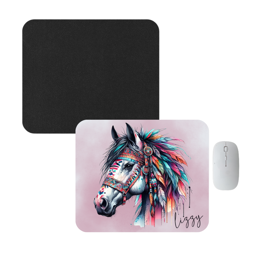 Add a touch of wild spirit to your workspace with our Personalised Native American Horse Mousepad. This mousepad features a stunning watercolour horse adorned with vibrant tribal feather headdress and the lucky recipient's name in a stylish bohemian script font. It's perfect for horse lovers, boho style enthusiasts, and anyone who adores unique equestrian accessories.